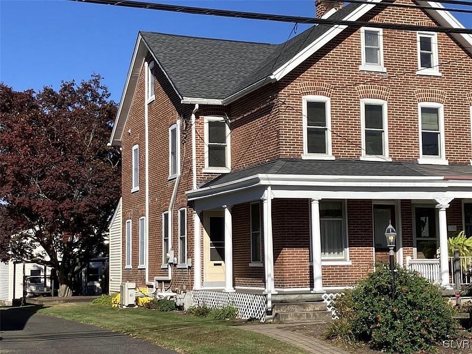 Built in 1905, this Brick Twin has lots of potential! While situated in the charming small town of Emmaus, it abounds with amenities and major commuter routes all close-by. The kitchen boasts hard wood flooring with exposed brick walls above a chair rail, complete with a vintage gas cook-stove and ample room for a table or island. Raised panel wood doors can be closed to separate the living area into two rooms. A full bath is located on first floor. Original wood flooring under carpeted areas. There are two bedrooms and half bath enclosed by raised panel pocket doors on the second floor, with a bonus room on the third floor for an an additional bedroom, office or studio with closets and built-in storage. The washer and dryer hookup are in the basement. Natural gas hot water heat and mini splits service the house. The two- car garage has lots of overhead storage space (refrigerator stays). The partially shaded back yard has a newer Trex patio and adjacent brick area for a fire pit. A little TLC will go a long way in making this house into your new home! Room sizes are approximate. "Being sold in "As Is Condition." PLEASE DO NOT USE THE DRIVEWAY, IT'S PART OF THE NEIGHBOR's PROPERTY.
