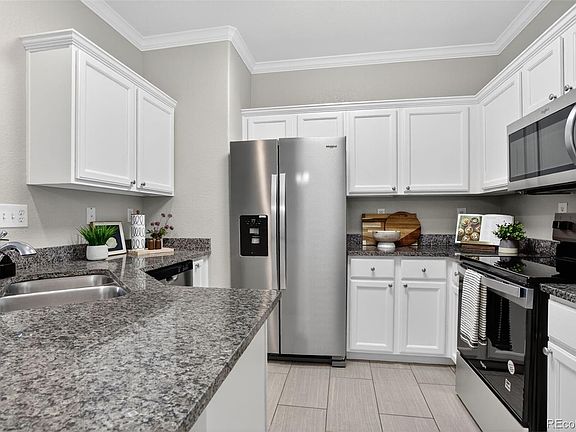 Move-in ready ground level two bedroom, two bath condo with an attached one car garage in the Cherry Creek School District! Beautifully updated with new slab granite countertops, new paint throughout, new carpet and pad, brand new kitchen appliances and a new water heater. Enjoy plenty of natural light, a tiled entryway and the spacious living room with crown molding, a gas fireplace and sliding glass door access to your covered patio. The kitchen features tile flooring, slab granite countertops, white cabinetry, all new stainless steel appliances and a spacious adjacent eating space with a brushed nickel chandelier. The primary bedroom is located down the hall and features brand new carpeting, a ceiling fan, new blinds, an ensuite 3/4 bathroom with new granite counters, new dual sinks and fixtures, tile floors, a tiled shower with sliding glass door and a large walk-in closet with several built-in storage shelves. For optimal privacy, the secondary bedroom is located on the other end of the condo and also features a walk-in closet, new carpet and paint and easy access to the full bathroom with new granite countertops and sink. Off the bathroom is the hall laundry closet which includes the washer and dryer. There is a brand new 50 gallon water heater, a newer furnace (2015) plus central air conditioning. The one car garage has direct access to the interior of the home and has plenty of room for additional storage, plus a driveway that allows for another off-street parking space. The well maintained Turtle Creek complex has just finished exterior painting on all the buildings, has all new roofs, gutters and impeccably maintained grounds without you lifting a finger! This condo is located just steps from the pool and clubhouse which includes a nice fitness center and secure mailboxes. If needed, public transportation is close by as well as shopping and restaurants. This is the one you've been waiting for, so schedule your private showing of this pristine condo today!