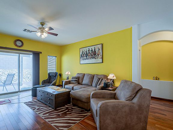 * A fantastic open concept home, with high ceilings, living spaces filled with natural light, beautiful flooring, and a smartly organized plan that truly lives so much bigger than just its ''sqft'' size. A great room with a gorgeous wood floor (recently installed) opens on one side to the covered, east-facing back patio and on the other to the great dining space and kitchen. In the U-shaped kitchen, a gas stove, plenty of countertop working space, bar-height seating, and cabinets and an extra counter space along the fourth wall. In the primary bedroom, warm wood floors, en-suite bath, and a walk-in closet (and this, the only carpeted space in the home--less than 50 sqft!--everything else being wood, tile, or laminate.) So much more: Explore 3D virtual tour, floor plan, and extended comment