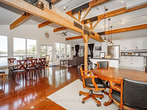 Fully furnishedOpen concept main floorExposed beam ceilingPrivate beach and dock