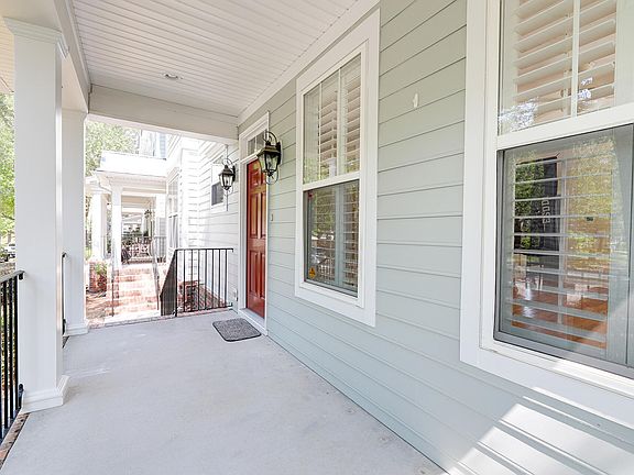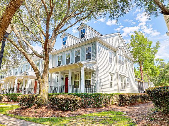 Absolutely gorgeous 3 bedroom and 3.5 bathroom corner-unit townhome located directly off Daniel Island Drive and in walking distance to nearby parks, 3 available community pools, boat landing, fishing, schools, library and restaurants. This townhome is freshly painted, features hardwood floors throughout the first floor except in master bedroom and closet. First floor also includes a gas fireplace, electric washer and dryer connections and plantation shutters. The living room is bright and spacious. Kitchen has white cabinetry with Corian countertops and black appliances. The first master bedroom is located downstairs and the two other master bedrooms upstairs all include their own private full bath, separate shower and walk-in closets.Enjoy sitting on the large front porch or the screened-in porch out back. The backyard boasts a tall privacy fence, a detached two-car garage with side garage door access to the backyard and an outdoor hot tub. Backyard professionally stoned and landscaped including outdoor garden lighting, rose gardens, and area for hot tub. Do not miss this opportunity to live on Daniel Island in a prime location! Southern living at its finest!