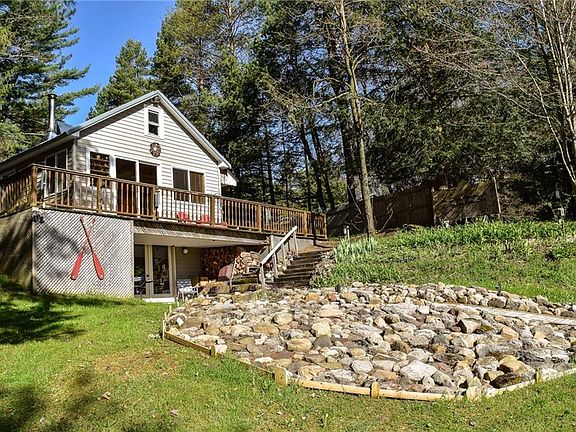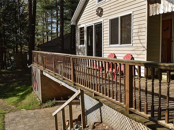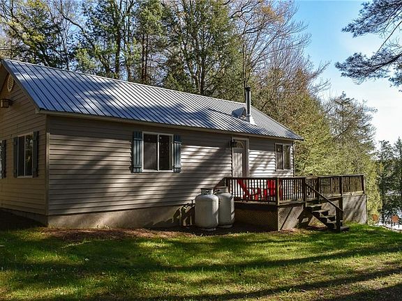 KAYUTA LAKE WATERFRONT HOME! This year round lakefront cottage was completely remodeled in 2013. A warm and inviting living room with hardwood floors, pine tongue and groove ceilings, new wood stove, and sliding glass doors, all leading out to a spacious wrap around deck overlooking the water. Galley kitchen with a small dining area, 2 bedrooms, one with a small sleeping loft, full bath on first floor, and another in the walkout basement. Lower level has plenty of custom built in cabinetry, tiled floors, and sliding glass doors allowing easy access out to the outdoor seating areas and waterfront. Gradual slope down to the water, with two fire pits, landscaped patio area, easy water sport launching, game areas, and much more! Put in a dock and tie up your boat and watercraft. This double lot also has a circular driveway, drilled well, updated utilities, outdoor lighting, vinyl siding, metal roof, new chimney, and much more! Don't wait, as this one won't be around long!