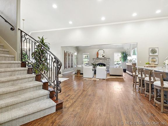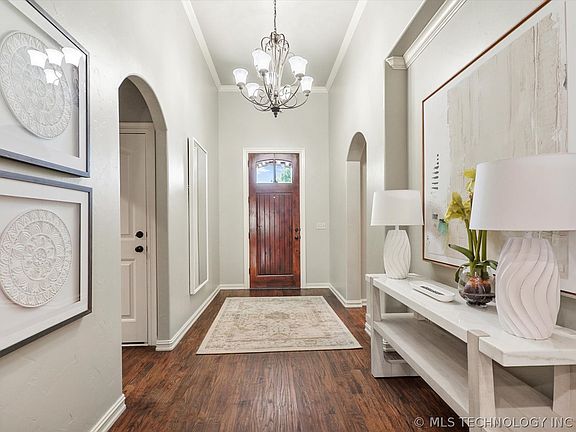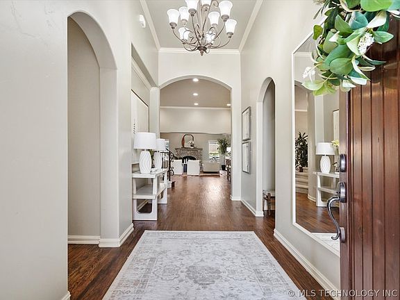 Welcome to your dream home in an exclusive, small, private gated community served by the highly regarded Bixby North schools. This stunning 2631 sq ft residence offers an array of premium features designed for luxury and comfort. Step inside to discover brand-new carpet, a stacked stone fireplace with hearth and mantle, and custom roller shades and plantation shutters that add a touch of elegance to every room. This primarily one-story home includes a versatile flex room upstairs, perfect for a home office, gym, or play space. The modern kitchen is a chef's delight, boasting new granite countertops, a walk-in pantry, and top-of-the-line appliances including a Miele dishwasher, Wolf double ovens and cooktop, Bosch refrigerator, and new kitchen sink and garbage disposal. True hardwood floors flow seamlessly throughout, complementing the fresh interior paint. The dedicated office provides a peaceful workspace with views of the serene, landscaped backyard. Enjoy the covered patio, an ideal spot to unwind and take in the beautiful surroundings. Have peace of mind with a high-efficiency Amana HVAC, tankless hot water, and all-new kitchen appliances. Every detail has been meticulously updated, from new toilets to new custom light fixtures, ensuring a move-in ready experience. Don't miss the opportunity to make this exquisite home yours!