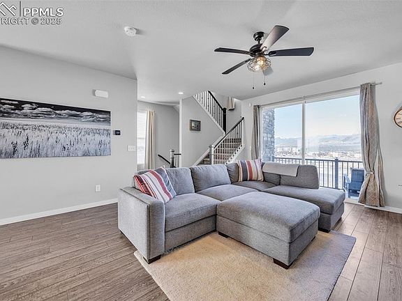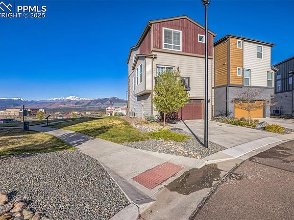 Location - Location - Location! Contemporary living at its finest! 3-level home on a premium lot with spectacular mountain views of Pikes Peak and the Front Range. Open main level with a combination of living room, dining area and a large designer kitchen with granite counters, beautiful tile backsplash, upgraded maple cabinets, stainless steel appliances and a walk-in pantry! Two composite decks. 3 bedrooms, 3 bathrooms, 2 car garage. Within walking distance to stores, restaurants, movie theater, coffee shops, brewery, Scheels, Great Wolf Lodge, New Life Church and more. Easy access to Santa Fe Trail, great connectivity to I-25 and Powers Blvd. This is truly one of the most desired areas of Colorado Springs!