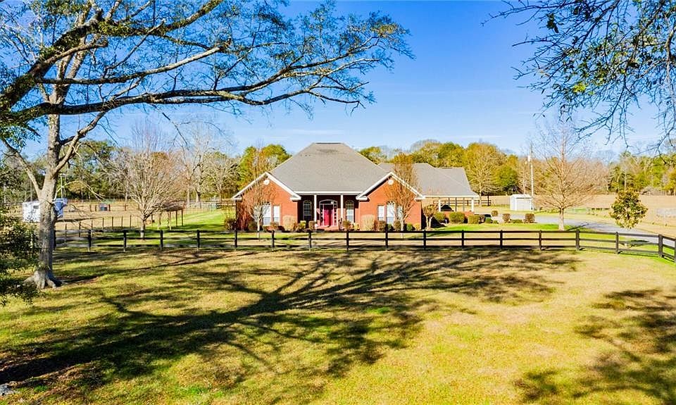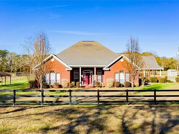 A truly remarkable property with exquisite amenities. The home is designed with an open floor plan that includes a kitchen with granite counter-tops and center island for additional space. The bonus room over the carport can be used as a 4th bedroom/ office/ media room , etc. The front porch offers a wonderful view overlooking the expansive front lawn for true southern living. The back patio overlooks the saltwater pool area as well as the additional amenities offered for the equestrians. This property is completely fenced and equipped with a 6 stall barn, tack room and workshop/equipment room. The barn measures an estimated: 56x70. That's not all, the horse arena is well laid out and fully lighted. Nothing more than to bring your horses, all you need is right here. The detail in building this home is evident with master bath featuring jacuzzi tub and separate shower with 2 shower heads as well as a tankless water heater. His and her closets, a built in ironing board, gas fireplace are just a few added touches. The home is equipped with both city water and well water for use. This is a rare find. Make your appointment today.