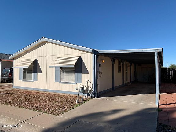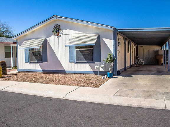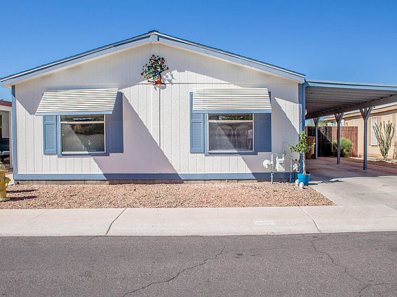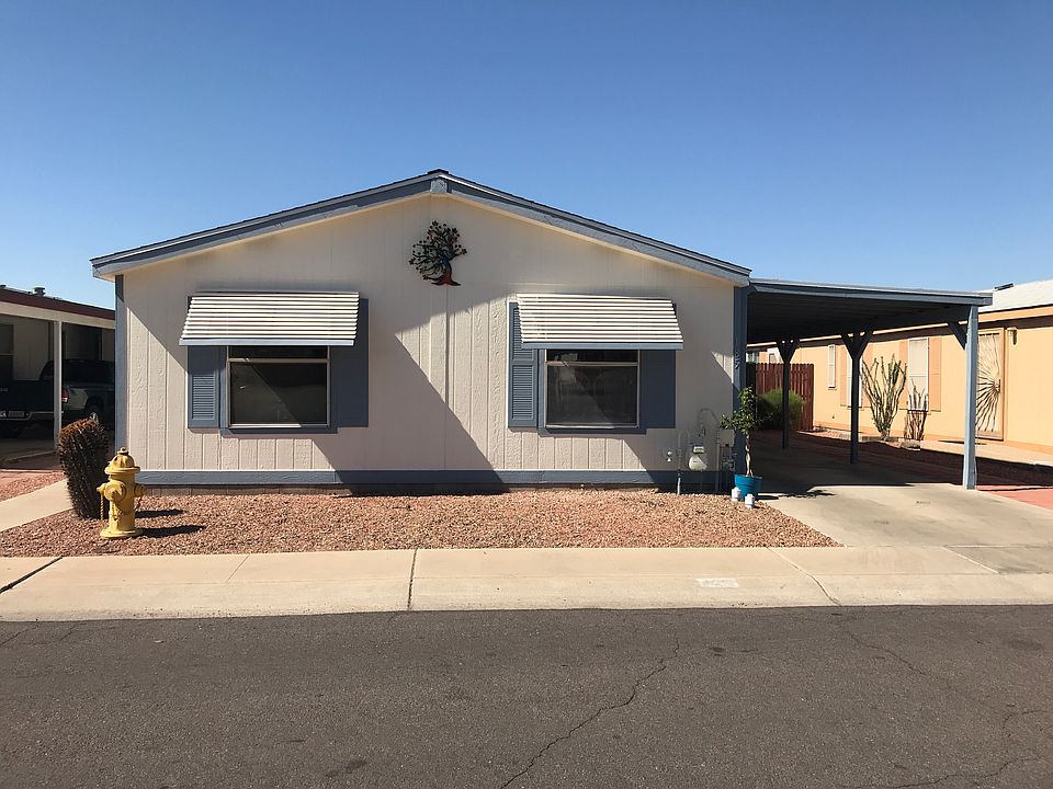 This 2 bed, 1.75 bath, 1200 sq ft home showcases vaulted ceilings, crown moulding, 3 3/4 in baseboards, dual pane windows, 6 panel interior doors, vinyl floors, newer A/C, roof, plumbing, duct work.. Skylights in the kitchen, master bath and guest bath keep the home incredible in natural sunlight. The two car tandem carport features and attached workshop with a separate A/C, foam board insulation & skylight. The private backyard has a covered patio and easy to maintain landscaping. The refrigerator, washer & dryer all convey. Desert Vista Place includes a children's playground and a community clubhouse with pool and spa. No additional lot rent, you own the land.