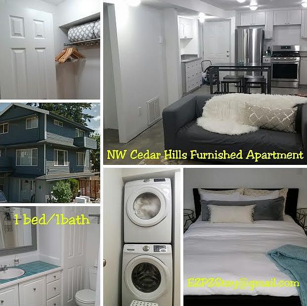 Short Term Rental - Fully furnished 1 bedroom, 1 bath legal ADU apartment in a Cedar Hills house, near St. Vincent, Nike, Columbia Sportswear and short drive to Good Sam Legacy, Intel, Keizer Hillsboro. Inquire about nightly, weekly and monthly prices.