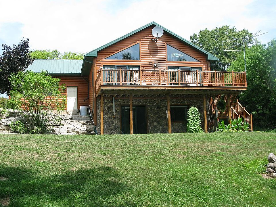 Beautiful home with river frontage! Open concept. Pella doors and windows, log interior. New stainless steel appliances. Large 3br, 3ba, extra 'bedroom' and office area. Stamped concrete patio. Large deck overlooking river. Beautiful views. Walk out basement. Over 3 acres, serene, and peaceful.