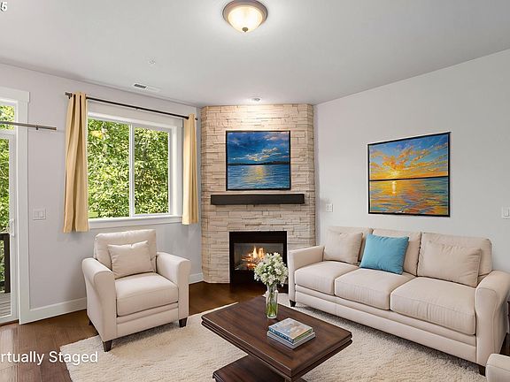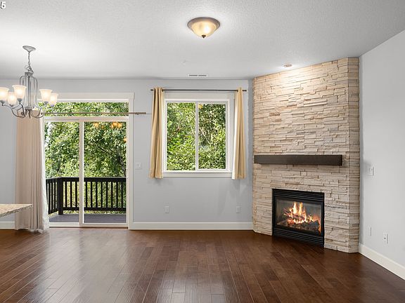 Welcome to this beautifully maintained 3-bedroom, 2.5-bath home in the sought-after Volare community of Happy Valley. The open-concept main level features hardwood floors, a striking floor-to-ceiling stone fireplace, and a gourmet kitchen with granite counters, stainless appliances, and rich espresso cabinetry. Upstairs, the spacious primary suite and two additional bedrooms provide comfort and flexibility for family, guests, or a home office. Brand new carpet and interior pain throughout. A private deck overlooks lush greenspace, offering the perfect spot to unwind while the HOA handles exterior and landscaping maintenance. Unique oversized crawlspace, perfect for extra storage. With access to the Eagles Landing clubhouse, fitness center, and golf course, this move-in ready home combines style, ease, and community living in one perfect package.