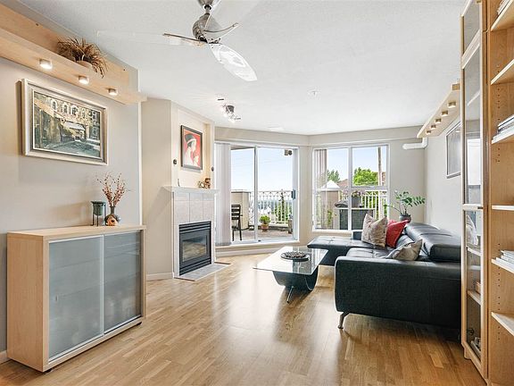 Centrally located, 2 Bed /2 Bath top floor with SW exposure. Featuring a European style kitchen with high end Kitchen Craft Cabinets, Corian Countertops, Miele Convection Oven, Miele Cooktop, Faber Hoodfan, Miele Dishwasher, and a built in wine fridge! Additional renovations include a fully renovated bathroom with a standup shower, hardwood floors, fresh paint, and custom blackout blinds. Relax in front of the cozy gas fireplace or enjoy the benefit of having a Daiken Heat Pump, providing AC and heating on those colder days. Large balcony is great for BBQ'ing while enjoying the gorgeous views of the City, Fraser River, and Alex Fraser Bridge. Walking distance to transit, parks, & shopping. BONUS in suite laundry with Bosch Washer/Dryer, 2 parking stalls and a storage locker. VR TOUR AVAIL