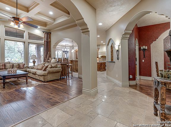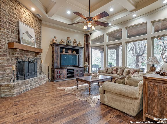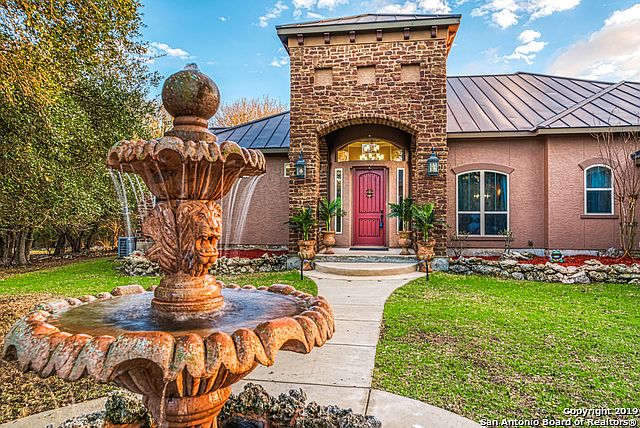 Luxury living in the beautiful Texas Hill Country. Sitting on over an acre, with mature trees surrounding, this home has everything! Custom chef's kitchen, gas range, subzero fridge, wet bar, walk in pantry, farm sink, knotty alder cabinets, soaring ceilings and speaker system throughout. Open floor plan boasts travertine floors, 2 indoor fireplaces, office, media room, and TALL windows. The outdoor features large entertainment area with kitchen and fireplace, shed and gorgeous covered patio.