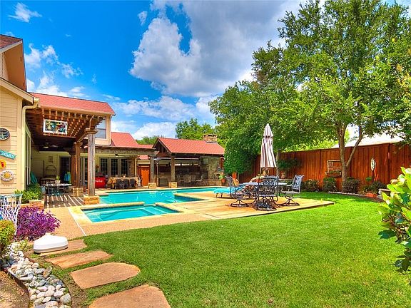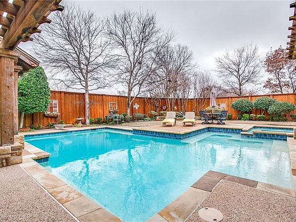 Beautiful home features 5 bedrooms, Study, 4.5 baths, 2 dining, living, game room. Entertaining and amazing back yard paradise complete with large pool, outdoor kitchen with grill and fireplace, sports court, patio areas and extra yard. French doors from living room and huge game room. Game room sports bar and pool table. Updated kitchen has granite, built-in refrigerator, soft close drawers, under counter lighting, double ovens and island. Elegant formal dining room. Spacious library study. Master Bedroom Suite includes exercise space off master bath. MB and 2nd bedroom down; three bedrooms up. Roof replaced 2017. Circular drive, corner lot and auto gate wood fence in back yard. RISD, near UTD.
