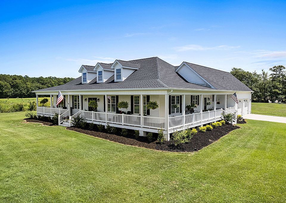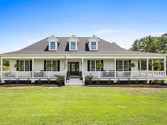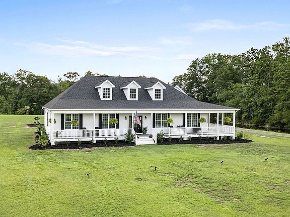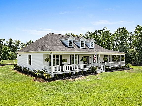 Your modern farmhouse dream home awaits! Nestled on 4.28 acres, set back from the road and with a pond on two sides this retreat is a rare find! Featuring a wrap around porch perfect for sunrise and sunset views, this home offers a spacious living room with a fireplace, leading to a covered porch and patio. The expansive kitchen featuring a farmhouse sink and a large island with storage and the dining area are perfect for entertaining. The primary suite boasts twin walk in closets, a recently remodeled bathroom featuring triple shower heads and dual temperature controls, a huge soaking tub and custom tile work. This home also features two guest rooms and a shared bathroom, an upstairs bonus room, walk in attic for plenty of storage, an oversized garage with 3 doors for convenient access to the grilling area and back yard. The property also includes a private fishing pond, a large detached storage building with insulation and a loft for extra storage. There are recent upgrades that include a new roof and remodeled bathrooms in 2023. All this just minutes from the beach, shopping and entertainment and with no HOA. The meticulously maintained landscaping and beautiful green grass are finishing touches on this incredible property. This home is a rare find and combines privacy, luxury and convenience- call today to see this beautiful property!
