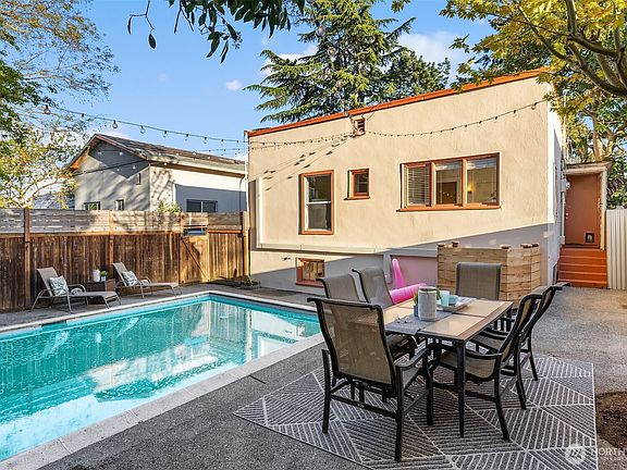 Discover this unique 1926 Green Lake Hacienda just blocks from Green Lake with quick access to Hwy 99 and I-5. This updated home seamlessly blends vintage charm w/modern touches: refinished hardwood, new appliances, fresh interior paint, new roof & A/C. The main level features an elegant dining room w/French doors & coved ceilings, 2 beds & a modern bath. The fully finished lower level offers flexibility as a separate living space, Airbnb or MIL suite w/its own entrance, 2nd kitchenette, 3 beds, full bat, & spacious living room. Relax in a private backyard oasis w/a solar-heated pool, steps from Green Lake Trail, PCC, Duke's & local dining. Enjoy urban convenience w/nearby amenities & the natural beauty of Green Lake just steps away.