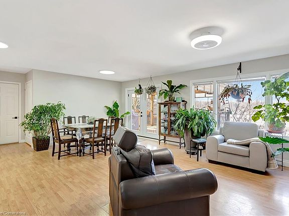 Attention nature lovers! Welcome to 1128 Notre Dame. This cozy 3+3 bed, 3 bath bungalow is located in the highly desirable town of Petersburg, backing onto Rebel Creek golf course with direct highway access and has enough parking space for 8 cars plus a 1.5 car heated garage. Inside this ranch style home, there is over 2000sq ft of living space and plenty of large windows to let in natural light and admire the picturesque view. Step inside this carpet free home to discover a beautifully designed and spacious living/dining room completed with an updated kitchen and bathrooms. French doors will take you from the dining room to a sizable upper deck where you can bird watch and take in the peaceful scenery. The primary bedroom is a sanctuary of comfort with an ensuite and sliding doors leading to your own private balcony, facing out to the golf course. The bright walkout basement features 3 more bedrooms and another full bathroom. For those who are looking for more private living space, there is an adorable cabin with its own bathroom with heated flooring, bedroom and living room. Follow the path through the gardens to the workshop which features a 2 story greenhouse. This unique property is a must see, homes like this don't last long! Roof 2017, A/C and furnace 2013