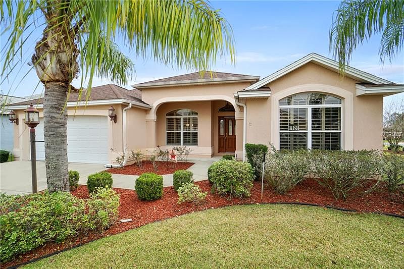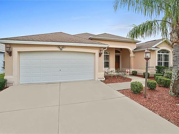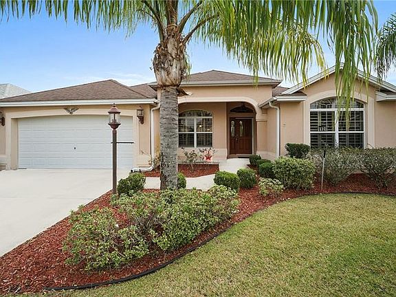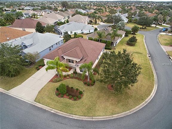 This gorgeous Gardenia in the Village of Largo is situated on a corner lot. Perfectly and conveniently located close to Lake Sumter Landing and Brownwood it is a MUST see!!! Plantation shutters in ALL the windows. Retractable screen in the front door allows for those warm Florida breezes on those balmy days and nights!! Telescoping sliders open onto the lanai which also has an entrance through the Master Bedroom. His and hers closets in the Master Bath as well as dual sinks. Corian counters in kitchen and both bathrooms. Brand new carpet in all the bedrooms. Third bedroom has no closet. New AC in 6/17. Home warranty will be provided. Beautiful and comfortable and just waiting for you!!! Don't miss this one!!