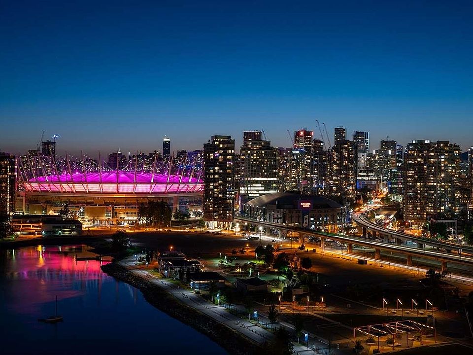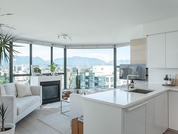 To all VIEW LOVERS. The coveted 01 home offers sensational mountain views upon entry as well as protected water views, city landscape, BC Place and beyond. The suite has been upgraded featuring updated kitchen, bathrooms, wide plank light oak floors throughout, high efficiency gas fireplace & line ready for a gas range. This one ticks all the boxes with floor to ceiling windows, 2 bedrooms, 2 bathrooms, 2 side by side parking, patio and views. Ample storage with California closets. Spacious principal bedroom that is hard to find now a days, with walk in closet and ensuite. Building amenities include 24/7 indoor pool/ gym, sauna, & hot tub. EV charging stations. Superb location across from the seawall, park, close to transit, and the home of the new St Pauls hospital.