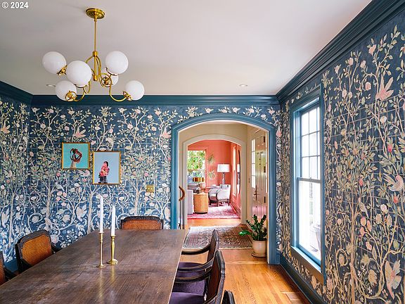 Tucked away behind a lush rhododendron hedge on a prestigious street in Portland's Dunthorpe neighborhood sits a colonial estate that gracefully blends the impressiveness of an expansive traditional home set on resort-quality grounds with the youthful energy and tasteful whimsy of a contemporary family retreat. Internationally recognized interior designer Jessica Helgerson led an extensive remodel of this home, crafting visually stunning spaces designed to encourage gathering with family and friends. Soaring ceilings and abundant natural light set the stage for entertaining in every room. The main level features a gourmet kitchen with three Sub-zero refrigerators and a Sub-zero freezer, gas Wolf range with double ovens, dual Miele dishwashers and a Wolf steam oven. The kitchen's built-in dining nook, oversized living and family rooms all provide easy access to the magnificent grounds with multiple sets of French doors exiting to one of the city's most luxurious backyards. Enjoy summers in the pool and hot tub, host friends for a pickleball tournament, relax around the gas fire pit or sit at the outdoor dining table while overlooking the expansive, verdant lawn.The private quarters on the second floor of this 5-bedroom estate with a separate guest wing are no less impressive. The focal point of the primary suite is an oversized gas fireplace flanked by windows overlooking the gardens, and the relaxing en suite bathroom offers a soaking tub, steam shower and infrared sauna. Each of the four additional bedrooms is en suite, displaying carefully curated designer lighting and a selection of the finest marble flooring and tiles. On the lower level, you will find a speakeasy with a full-sized home theater, bespoke card table, and wet bar; an adjacent game room with reading nook outfitted with lacquered wood paneling and hand-painted De Gournay wallpaper; and a laundry suite befitting the scale of the estate. See attached list for more incredible features.