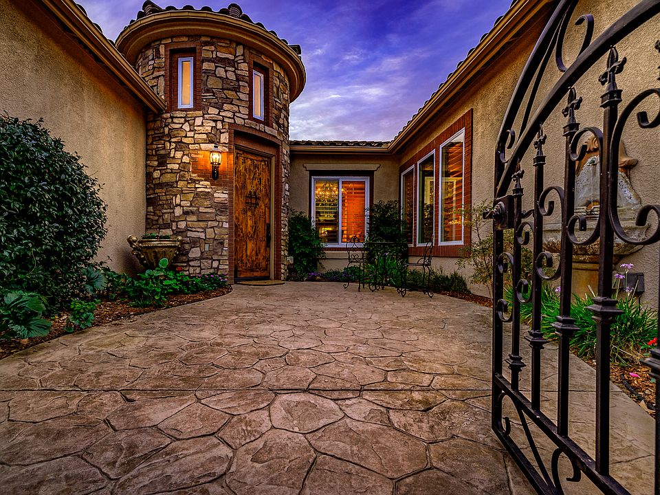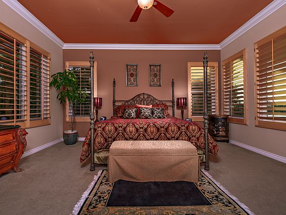 Stunning home in the Tanglewood Estates that has an exquisite courtyard entry with wrought iron gate! Gourmet kitchen boasts top of the line stainless steel appliances, granite countertops, island seating, maple cabinetry, nook and travertine backsplash. Spacious master ensuite is situated on the other side of the home away from guest suites with dual vanities, double sinks, soaking tub, separate walk in shower and walk in closet. Optional office. Tile flooring throughout most of home w/manufactured oak wood flooring in the family, dining and living room. Natural wood plantation shutters and striking crown molding throughout with ceiling fans in every room. Relax on your patio while taking in the striking westerly views.