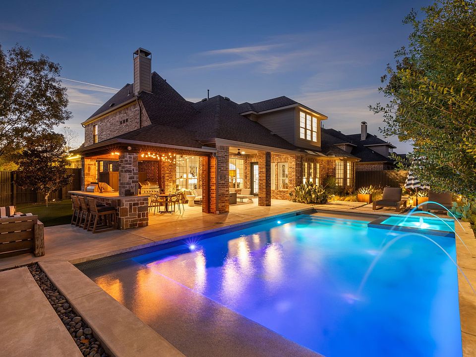 Welcome to your luxurious dream home in the Villages of Stonelake Estates! This stunning, West facing home, offers the perfect blend of sophisticated design and resort style living. Every detail meticulously curated to provide ultimate comfort and elegance. Over $250k in upgrades invested within the past two years elevating this home to the finest around. Double height ceilings and illuminated glass-enclosed wine storage upon entry to the foyer. Entire interior painted. All light fixtures and fans upgraded. Hardwood nail down oak floors on both levels. Gourmet kitchen featuring professional level True brand refrigerator, Wolf stove, built-in wine fridge and wet bar. Large island open to living and eat-in kitchen easily accommodates family get togethers and parties. Private owners suite on the first level features a custom $50k dream closet and renovated bath with large walk-in shower and freestanding soaking tub. Guest suite downstairs has ensuite full bath. Powder bath downstairs and second powder bath upstairs caters perfectly to guests. Oversized game room features wet bar and beverage fridge. Step into the cozy media room to watch your favorite TV show or play a movie with true theater level performance. Three spacious bedrooms upstairs provide a quiet retreat. The backyard is like stepping into a hill country resort. Large covered patio includes an outdoor kitchen spacious enough to dine and lounge. Modern Gold Medal pool with soothing fountains. Hayward pool control app. Ample pool decking allows for multiple patio furniture arrangements and sun loungers. Natural gas firepit and artificial turf with putting green. Thoughtfully designed Texas native inspired landscaping. Adjacent to paved walking trails. Half block to community pool. One block to community park and top-rated Ashley Elementary. This home truly has it all: unparalleled luxury, world-class design and exceptional location. Schedule your private tour to experience the epitome of Frisco living.