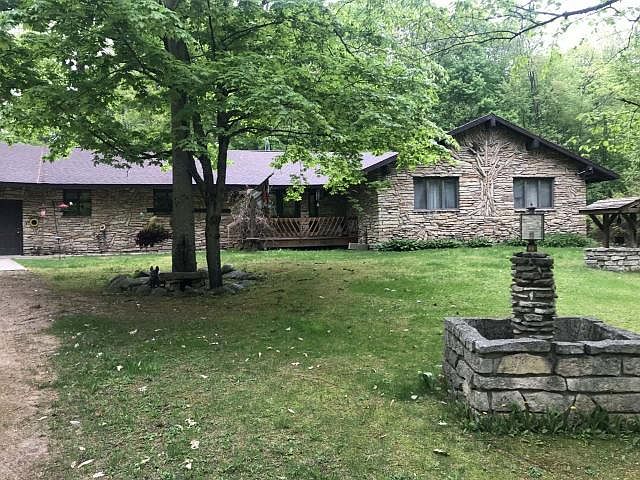 Winding driveway thru the wooded 13 acres will lead you to this custom built 1 owner home. Beautiful stone home features 3+ bedrooms, 3.5 baths, kitchen with custom cabinets, living room with a wood burning fireplace. Master suite with sunken tub and patio doors that lead to an indoor pool room with pool, slide, hot tub and full bath! 1300' of entertaining fun! Large deck and total privacy, yet close to town. Direct access to the trails for added fun!