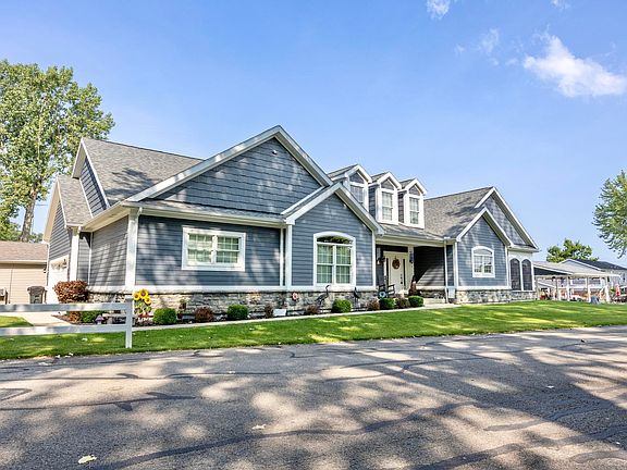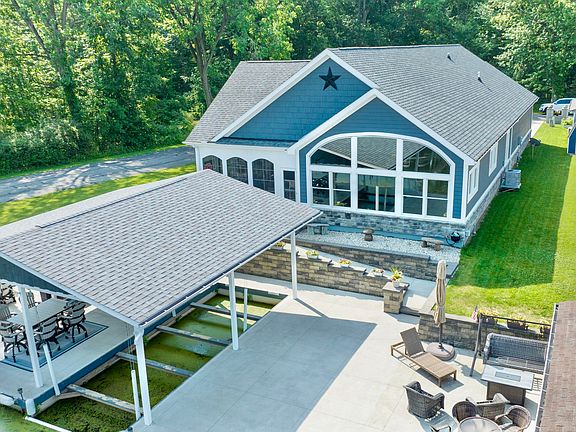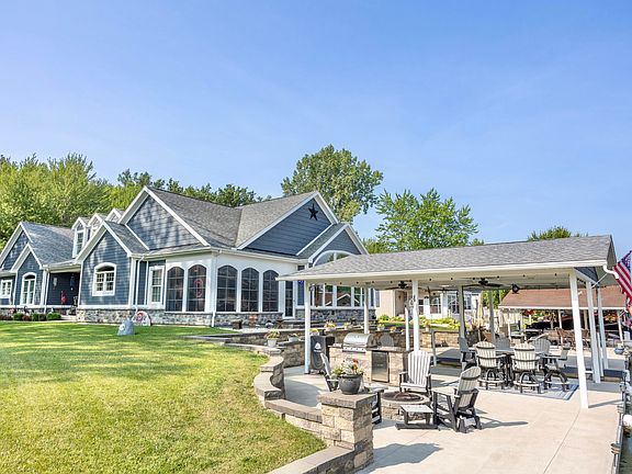 This four bedroom, three full bath home is situated on a corner channel lot and is absolutely fabulous, inside and out! The lot has 87' of water with an awesome dock and patio area at the water's edge. The boat dock is newer and is all metal and was built by Shoreline Construction. The front porch is huge and is another great outdoor space for sitting and enjoying family and company. When building the home, the Owners were building it as their 'forever home' and everything is top notch. The huge great room has vaulted ceilings, a gas fireplace, bull-nose corners, strategically placed huge windows and more. The kitchen is absolutely gorgeous with beautiful cabinets and countertops, a large bar area for dining and visiting, and wonderful appliances. The bar area has a pull down tv. Two bedrooms are on the main floor, along with two full baths. Upstairs are an additional two bedrooms and another full bath. The first floor also has a huge 4-season room on the water side of the home which is perfect for entertaining. The garage is oversized and has openers and plenty of storage. There is a 'basement' that is accessible from the garage and is perfect for storage and your personal storm shelter. You MUST see this amazing home to appreciate all it has to offer!! There are far too many amenities to mention.
