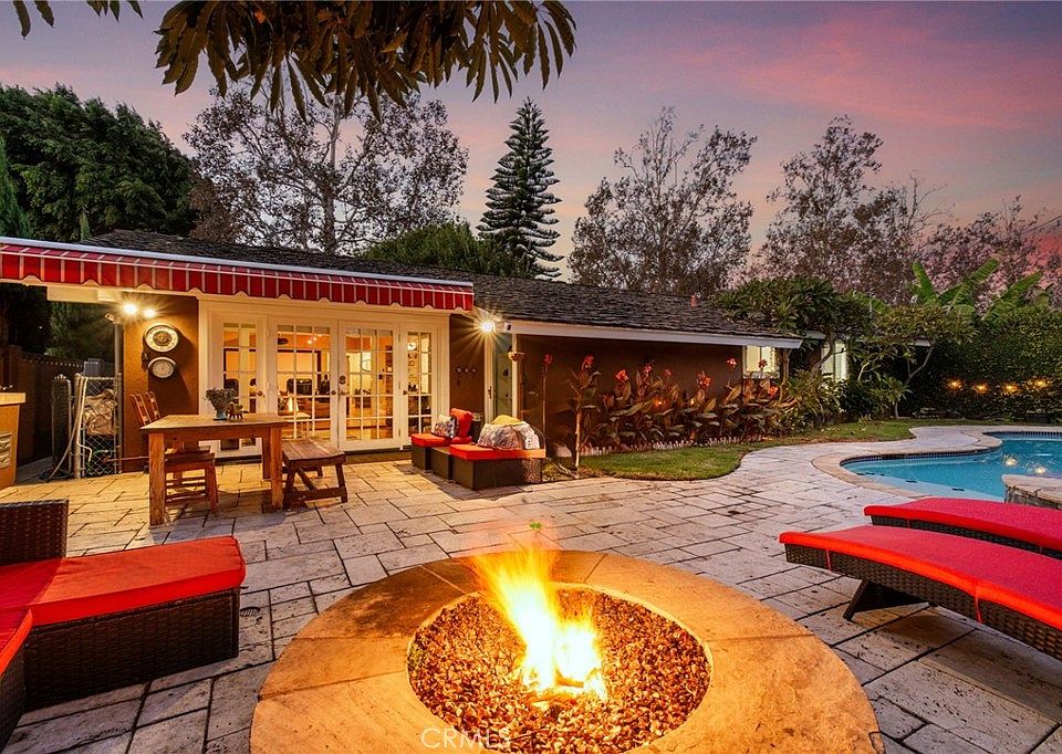 Welcome to this stunning single-story pool home located in the highly sought-after Rossmoor neighborhood boasting two Primary Suites. Behind the inviting gated entry lies a serene atrium courtyard. A grand double-door entry with oversized sidelights floods the interior with natural light creating a warm & welcoming ambiance. Step into the spacious family room where an elegant travertine fireplace, dramatic A-frame ceiling & chic pendant lighting combine to create an inviting space. Perfect for entertaining, this room features a home theater system, projector screen & theater-style reclining chairs; a home theater experience in the comfort of your living room. Hardwood floors throughout enhance the appeal. The charming dining room, anchored by a cozy brick fireplace & built-in bench hearth, connects seamlessly to the kitchen. The kitchen is both stylish and functional offering granite countertops, breakfast bar & ample cabinetry for storage. Adjacent to the kitchen you'll find a versatile (enclosed porch) office space w/view of the rock garden & koi pond perfect for remote work or study. A utility room converted from the interior laundry room into a hair salon with direct access to the attached two-car garage w/custom cabinetry, ample storage, laundry hook-ups & 220 volt wiring. Each of the 2 primary suites are designed for comfort and privacy. The primary retreat is situated in its own wing offering a walk-through closet leading to a spa-inspired ensuite bathroom with a double vanity & oversized walk-in shower. The second suite located near the kitchen is ideal for guests, complete with its own three-quarter bath ensuite. 2 additional guest bedrooms share a full hall bathroom. The backyard is an entertainer's paradise. Step through the sliding French doors to discover a built-in BBQ island, a cozy fire pit & sparkling pool & spa surrounded by lush landscaping including palm trees, a mature orange tree & ivy-covered walls. A dog run & custom side gates add functionality & charm. Additional upgrades include: Dual-pane sound resistant windows, New high-efficiency HVAC system (2023), Custom cabinets & granite countertops throughout, High-efficiency saltwater pool system (2023), Smart security system w/full-door, window, and motion coverage. This home blends classic charm w/modern updates with a perfect balance of comfort, style & functionality. You'll be living in comfort in this neighborhood situated in the award winning Los Alamitos School District.
