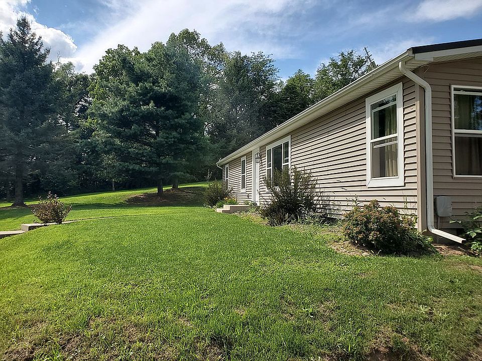 Completely renovated 1 story home on rolling 10 acres with open design deck overlooking GORGEOUS views to back of property. Did I say completely renovated??? New subfloor, new windows, new fixtures, cabinets, flooring, siding, metal roofing and more!!! This large 3 bedroom manufactured home is open, clean, bright and a joy to walk through. Large out-building has tall overhead door, office area and plenty of room to hang those deer you hunt on the property or store large equipment, toys or work on do-it-yourself projects. Great opportunity here and is a favorite scenic area of Southwest Michigan of rolling hills and country living. Check it out today in virtual tour, video walk-through and drone photos.