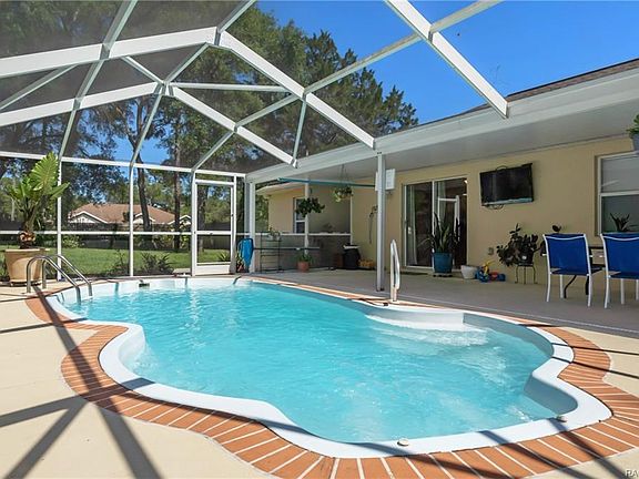 Delightful place to call home. The Joanne model is located on a corner .69 acre lot, fully board fenced with an RV parking pad ready for you to utilize for RV or build a shed or workshop in location. 3 bedroom pool home with huge lanai is the place to be this summer & year around. Very popular floor plan with front areas for living & dining, & graceful arches separating the family room & kitchen with nook. All overlooking the pool area & back yard. Kitchen is great with prep island & 2 closet pantries for lots of storage. 2 bedrooms on East side & 2nd bath, Master on West side. Pool area offers a covered lanai & fiberglass pool for easy & low cost maintenance. Yard is fully irrigated with well & nicely landscaped. Plenty of room to play and enjoy living in the "country". Double gates for vehicle access to back yard & single walk gate on East side. All of this on a paved road! Sellers will offer $2000 towards flooring allowance for your choice in the bedrooms.