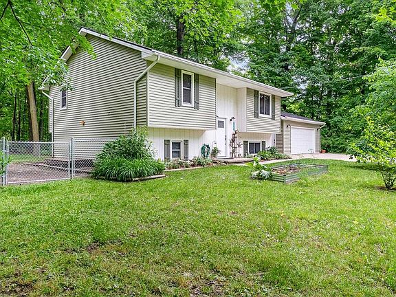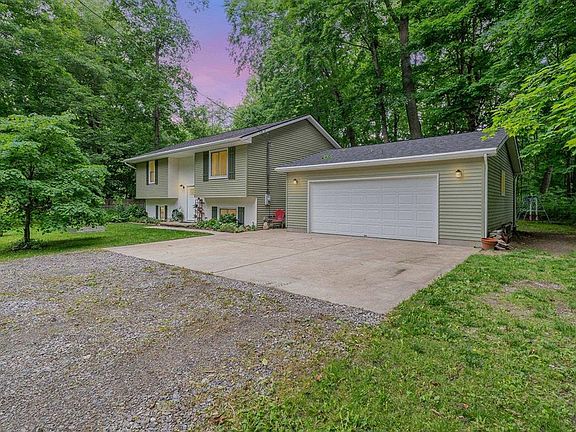 As soon as you enter this parcel you are in a nature lover's paradise! This extremely well cared for 3 bedroom bi-level home has the most magical location surrounded by soaring, mature maple, hickory & pine trees. It is home to one of the largest Oak trees I've ever seen as well as perennial plantings, berry bushes, morel mushrooms, wild flowers and lots of wildlife including deer, birds, bunnies & more. Enjoy the winding, gravel trail through the woods or the backyard firepit with a cute little playhouse nearby perfect for the kids or to make into your own escape. Enjoy lounging on your extra large balcony style deck overlooking the fenced portion of the yard and the wooded acreage. There is a patio area wired for a hot tub & an outdoor shower! As amazing as the outside of the house is, the interior is completely updated and boasts both comfort & charm. The hardwood floors flow through the main level and compliment the wood beams in the vaulted ceiling. The living room opens up to the dining room with the slider to the deck. The kitchen remodeled in '20 has granite countertops, gray cabinetry and a beautiful tile backsplash along with included stainless steel appliances. There is a large pantry also. The full bath has tile flooring and a custom tile surround in the shower. The primary bedroom is so spacious with a huge walk in closet and also has a sitting room adjoining it. Create your own private oasis! The lower level offers 2 more roomy bedrooms and a large family room that could easily be a 4th bedroom if you need that. The mechanical room has the laundry hook ups, laundry tub and updated furnace ('21), HWH & R/O system. The breezeway connects you to the 2 car garage with workbench & insulated closet. Other updates include complete re-roof in 2019, Central Air in 2021, back fed for generator use in case of power loss in 2022 and the same year an irrigation system to the huge garden area in a clearing at the back of the property. New gravel driveway in 2023 & this year fresh paint throughout the house. Cute veggie garden in the front yard. 5" well & storage shed too. Enjoy all this in a country setting just outside of the Village of Byron and 20 mins or so to Howell & Fenton. Hurry and schedule an appointment!