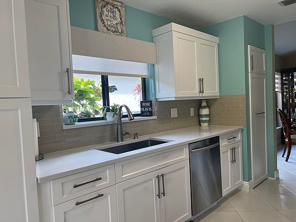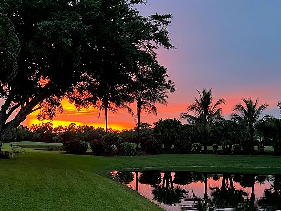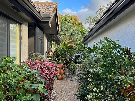 Immerse yourself in the tranquil oasis of rare tropicals and palms that adorn the landscape of this Boca Woods home. Lovingly designed by a certified landscape professional, every corner of the garden boasts vibrant blooms, scented plants and lush Foilage carefully selected for year round color to create a retreat where you can unwind and connect with nature and enjoy the sunset views over the lake. There is also a Mango tree to enjoy! You can even fish on the Bass stocked lake right from your backyard. The Garage boasts Epoxy Floors, BRAND NEW HURRICANE DOOR AND DOOR OPENER, Extra Room for a Refrigerator and there are extra cabinets on the wall for storage. You also have pull down steps to the attic with added flooring for storage.