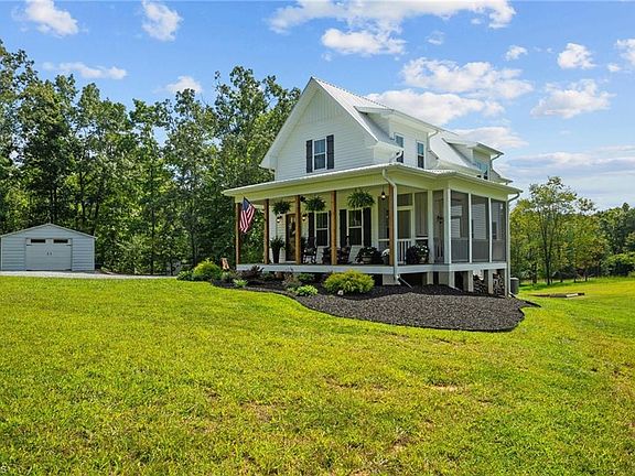 Welcome to your dream home! This custom-built, farm-style house, completed in 2018, exudes charm and attention to detail. Based on the Southern Living "Sugarberry Cottage" plan, this home features an open floor plan bathed in natural light. The main level boasts a double-sided fireplace, perfect for enjoying breathtaking sunsets from both the living room and screened porch. The well-appointed kitchen includes a center island and ample countertop space, ideal for cooking and entertaining. The primary bedroom on the main level offers a luxurious ensuite with a soaking tub and a walk-in tile shower. Upstairs, you'll find a versatile space that can serve as a den, office, or kids' play area, along with two additional bedrooms and a full bathroom. The basement includes a recreation room, extra laundry, and storage space, with its own exterior entrance. Situated on 6.41 acres, this property provides plenty of privacy and room to roam. An additional outbuilding is also included.