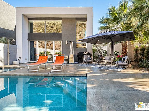 Gorgeous mountain views and privacy are yours at this gated luxury rental in South Palm Springs. This FULLY FURNISHED modern-contemporary meticulously maintained 2bd/2.5ba was recently renovated in 2023. Downstairs features high ceilings, contemporary chandelier, oversized fireplace with floor to ceiling stone wall, hardwood flooring and Sonos surround sound throughout. Upgraded kitchen, Viking Appliances, marbled porcelain counter tops, and beverage cooler. The collapsible glass doors lead you seamlessly to a professionally maintained tropical backyard with landscape lighting, heated saltwater pool/spa, waterfall with fire feature and a separate fire pit. Back inside, the lighted stairs lead you to the master and junior suites as well as an upstairs coffee bar. Both bedrooms have on-suite private baths, custom closets, lighted/heated mirrors, and glass and stone enclosed oversized walk-in showers with rainfall showerheads. Owner solar. Property features a climate controlled 2 car garage, epoxy finished flooring, water softener, tankless water heater, and laundry. This amazing property is walking distance to downtown shopping, restaurants, nightlife and many hiking trails. Available for seasonal or long-term lease. Pets welcome.