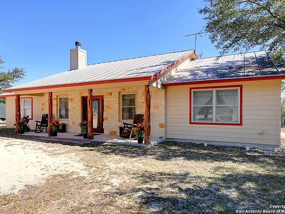 Beautiful Hill Top View Property. 3/2 home on 6 acres just minutes from Blanco, TX. Manicured 6-acre tract has large Live Oaks and abundant wildlife on the property. Thirty-Rainwater collection system supplies the home. Also has well as a backup source of water. Fenced raised bed garden with a greenhouse ready for your homesteading projects. The home is well built with a sensible layout. Constructed with 2x6 walls. Well insulated. Custom Pecan Wood Cabinetry throughout the home. Easy commute to Austin or San Antonio. Lots of value for your $$$.