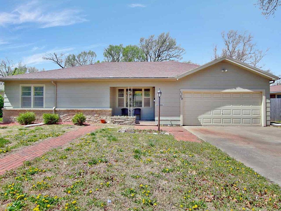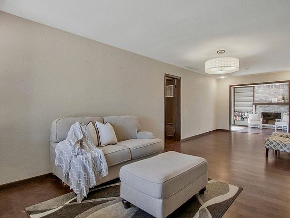 Beautiful, wide-open-concept ranch! Wood flooring throughout sprawling front living room and huge family room space. Gorgeous brick fireplace near wide spacious windows. Bright, white kitchen with eating space, tons of cabinets, and plenty of counterspace for cooking and entertaining! ALL APPLIANCES REMAIN! Main bedroom is unusually large with extensive closet and storage space. Master bathroom is updated with double sinks and corner shower. Hall bathroom is roomy and bright with tub & shower combo. Separate mud room and laundry space right around the kitchen space, next to 2-car garage is more conenient than most homes! Large, fully-fenced backyard with mature trees for shade and nice brick patio for relaxing any time of day... You'd better see this home today!