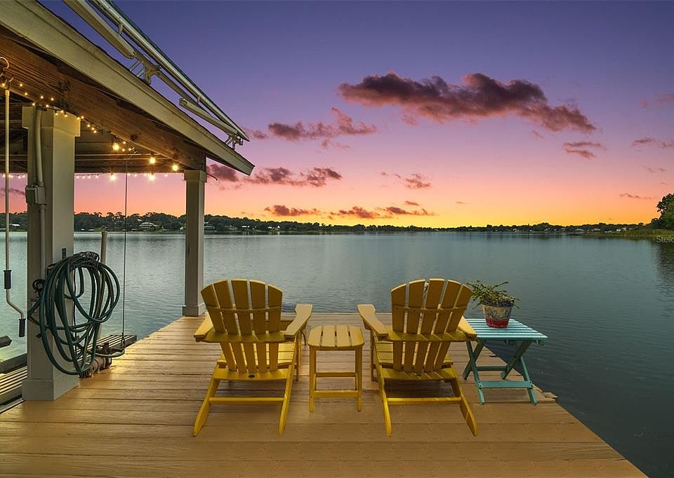 LAKEFRONT MOUNT DORA! SOPHISTICATED HOME ON SPRING FED LAKE GERTRUDE. This custom-built luxury home offering 4 bedrooms, 3½ baths, and approximately 3,364 sq ft of refined living space is on a generous 0.84 acre lot. Poised majestically on a hillside overlooking coveted Lake Gertrude, this exquisite property provides lakefront living at its finest with 100 +/- feet of waterfront, complete with a private beach, covered boat dock and sun deck, powered boat lift and retractable awning —perfect for lakeside recreation and entertaining! Designed by renowned local builder Sam Sadler in 2000, the home remains in near-new condition and features timeless architectural elegance. ?The front entrance features a welcoming brick staircase and covered porch with French-style double doors. Mature landscaping, stone pavers, and a concrete walkway enhance the curb appeal. Step into the Florida Room offering breathtaking elevated lake views. The bright, open living room boasts wood floors, cathedral ceilings, intricate millwork, bookshelves, a wood-paneled gas remote fireplace, with built-in entertainment components and classic crown molding. The chef’s kitchen & eat in area, also with lake views, features custom cabinetry, granite countertops, a breakfast bar, center island, built-in appliances, ceramic cooktop, and ample pantry storage, with easy flow to the formal dining area, laundry room and convenient half bath. The primary suite offers peaceful lake views and a spa-inspired bath with garden whirlpool tub, frameless glass shower, dual vanities, private water closet with backyard access, and a spacious walk-in closet. The second guest suite features its own bath with stained-glass skylight and artisan Kohler fixtures, while the third bedroom—accessed through French doors—serves beautifully as a home office or studio. A covered breezeway connects to the 720 sq. ft. detached two-car garage with workshop space and a private guest suite above with full bath—ideal for extended stays or a retreat. The layout includes a gracious circular driveway in the front with plenty of parking and wooden deck area overlooking the lake, complemented by convenient rear access from Highview Road. The private backyard area offers beautiful landscaping and patio with plenty of entertaining space and room for a pool. Additional highlights include new roof and gutters with LeafGuard (April 2022), upgraded water heaters (2018, 2019), modern HVAC systems (main Lennox in 2015, Fujitsu split for garage suite in 2016, Trane in the master suite 2023), a year-long American Home Shield warranty, a RainBird sprinkler system using lake water, SimpliSafe alarm system, central vacuum system, and a whole-house propane generator- 120 gallon LP tank (owned), built in floor safe Ideally located, this home is just minutes from Mount Dora’s vibrant downtown with its historic galleries, boutique shops, fine dining, parks, and year-round festivals—easily reached by stroll, bike, or golf cart. You’ll also enjoy an easy commute to Orlando International Airport, the Atlantic beaches, shopping, theme parks, and more. This residence beautifully combines modern luxury with the relaxed elegance of true lakefront living. Furnishings and golf cart are negotiable.