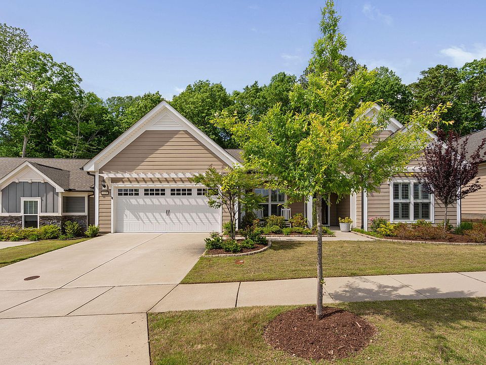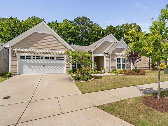 Welcome to easy luxury living in Del Webb at Traditions—one of the Triangle's most sought-after 55+ communities! This gorgeous Dunwoody plan offers the perfect blend of upscale design, thoughtful layout, and private outdoor living. Inside, you'll find 2 spacious bedrooms plus a versatile office—ideal for hobbies, working from home, or just relaxing. Guests will love the private suite with its own full bath, giving everyone their own space. High-end finishes throughout the home, from the rich luxury plank flooring to the custom window coverings and shutters, designer lighting and other elegant upgrades. The gourmet kitchen is a chef's dream with wall ovens, a gas cooktop, a huge center island, and tons of prep and storage space—all open to the dining area and a cozy family room with a gas fireplace, perfect for entertaining or quiet evenings at home. The oversized primary suite is a true retreat, featuring a spa-like walk-in shower, dual vanities, and a custom-built closet that makes organization a breeze. Open the sliding glass doors onto the screened porch and extended patio, where peaceful views of the tree-lined backyard offer the perfect place to unwind in privacy. Lots of storage in the oversized garage with built-in cabinetry. Enjoy the vibrant community with resort-style amenities including an indoor pool, pickleball, a clubhouse, fitness center and more!