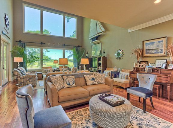 ON DEEP WATER!! BREATHTAKING VIEWS OF THE MARSH & RIVER FROM ALMOST ALL ROOMS IN THIS SPECTACULAR HOME!! This relaxing home was designed to showcase the views!! An oversized Great Room opens into the Dining Area, which is perfect for a very large table. The gourmet Kitchen includes gas cooktop, custom cabinets, & center island. A relaxing screened porch can be accessed from the DR and the GR. There is an elevator from the garage to the 2nd floor (with room to extend to the 3rd floor). The beautiful Master suite is on the 2nd floor & opens to a screened porch. The 3rd floor has a library/study & 2 large BR;s, & each has a private bath. Downstairs are 2 other Bedrooms & BA. From the beautiful backyard, the walkway leads to the deep water! There's a stationary dock & a floating dock with a dock house.