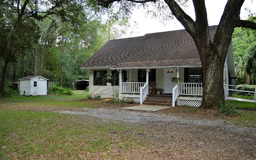 Cottage style, 2 story home located on beautiful 17+ acres. Property is covered with a variety of beautiful trees including several majestic Live Oak trees. Home offers a first floor master bedroom and bath, two bedrooms and a bath upstairs. Corner wood burning stove can be enjoyed from both the living area and breakfast nook. Sliding doors make easy access to the large, in-ground, screened pool. Outside you will find a hobby room/workshop, storage building and a 2 car carport. There is a transfer switch installed at the home for a generator as well. Trails through out the property make for a great place to take your morning or evening walk and you may even spot some wildlife.