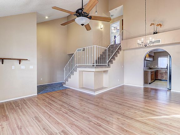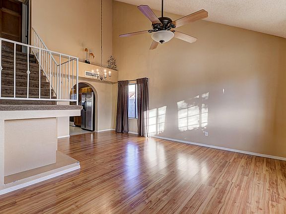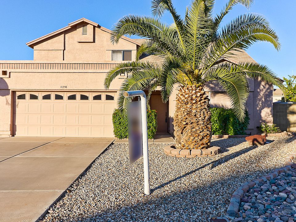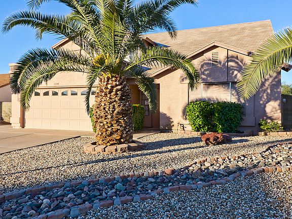 This two story home in Peoria is waiting for your special touch. The good sized family room has significant built-in storage, lit by a sliding door and an additional window. It's cooled by two large ceiling fans. The nearby kitchen has ample room in cabinets and a good sized pantry. Well placed windows supply natural light throughout the house while arched doorways add a unique touch to the space. Neutral paint and carpet means this home is move-in ready. Both front and back yards are beautifully landscaped. The front has low maintenance gravel and two established palm trees divided by a stone wash. The back yard has a patio, covered with lacy green vines, surrounded by lush grass. Stone edgers border the grass, the remaining landscape just waiting to be planted with herbs or roses.