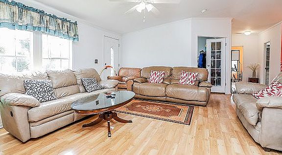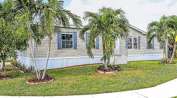 **HOME IS IN LAND LEASE COMMUNITY. NO REALTORS PLEASE** **IMAGES ARE VIRTUALLY STAGED** -------------------------------------------------------------------------------------------------------- Located on a corner lot near the lake, guest parking and the community bus stop, ‘Villa Tranquility’ is a beautiful three-bedroom house with an added den / fourth bedroom. From the curb, this house is picture perfect with it’s elegant creamy beige exterior walls complemented by Mediterranean blue decorative shutters. The surrounding landscaping includes several mature palm trees which add to this lovely home's desirability. The large covered carport offers ample parking for two cars. The entrance opens into a spacious open-concept living and dining room, with the kitchen partially partitioned off the space, tucking it away from direct view of the living room. Chandelier fan in the living room, and throughout the home, help provide pleasant air flow in the home, complementing the Central A/C, which was replaced in 2016. A separate study/den/family room provides flexible use space located just off the living room. The dining area adjacent to the kitchen has a mini-blind treated window offering light and air. The galley style kitchen comes equipped with essential modern appliances, including a smooth top range, side-by-side refrigerator, dishwasher and microwave. White cabinetry contributes a modern lightness to the area, and gives an airy spacious feel. A laundry area is beyond the kitchen offering space for a full sized washer and dryer. In the large master suite, two large windows invite natural light, while a chandelier fan helps to regulate the air flow. The master boasts a stylish European closet and an en suite bath his and hers sinks, a roman soaking tub and a separate shower. The entire house has lovely hardwood laminate flooring, installed new in 2012 while the bathrooms have maintenance-free vinyl tiles. A bonus feature of this home is a lovely patio that is perfect for experiencing the glorious Floridan outdoors, with lighting installed for evening enjoyment. Additionally this home has a brand new roof! Finally, like all homes in this lovely lakeside community, you will enjoy central air and heat, off-street covered parking, your own outdoor storage shed, professional landscaping and sprinkler system, and access to the community's extensive recreational amenities including enormous heated pool complex, new fitness center overlooking the pool and lake, tennis, basketball, clubhouse, sauna, relaxation room, lake recreation and more. To schedule a tour of this lovely home, contact Nidia at (954) 417-0343. Ask for "Villa Tranquility", 8/22-PL. **HOME IS IN LAND LEASE COMMUNITY. NO REALTORS PLEASE**