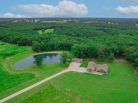 This spacious single-level home situated on 16.77 acres of beautiful countryside, offers 4 bedrooms, 2.5 bathrooms and a bonus bedroom/office space. The master bedroom hosts a built-in storm shelter, providing a safe and secure space during severe weather. Discreetly integrated into the closet, this storm shelter offers peace of mind without compromising the room's aesthetics. The property features a large pond, adding a serene water element to the beautiful landscape. The home is designed for easy, comfortable living, all on one level. The expansive yard includes a fenced in backyard, perfect of pets or children's play area. Additionally, There's ample space for livestock, making it an ideal setting for those looking to embrace county living. With plenty of room to roam and enjoy outdoor activities, this property combines the tranquility of rural life with convenience of a well-designed home. The detached garage offers a well-insulated environment, making it suitable for year-round use. The spacious interior provides ample room for vehicle parking as well as additional storage. Whether you're looking to store tools, equipment, or seasonal items, this garage ensures your belongings are kept safe and protected from the elements. Its functional design makes it a valuable addition to the property, catering to a variety of storage and workspace needs. The home sits back of the highway and is private but provides quick access to the highway for your daily trip to work. Property is situated near Pomme De Terre Lake, Truman Lake and Lake of the Ozarks.