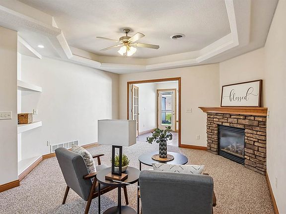 Cozy corner gas fireplaceFrench doorsZero-lot-line ranchSpacious open-concept layoutBuilt-in shelvingDedicated dining spacePrivate bath with vanity