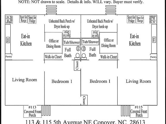 Great opportunity to own an investment property close to downtown Conover. Your tenants can enjoy walking to the Farmer's Market, shopping, eating, concerts in the park, etc! Each side offers 1BR/1BTH with a living room, eat-in kitchen, dining area (or office), bedroom, full bath w/walk-in closet within bath, and a back unheated porch (for storage & dryer hookup). Hardwood & vinyl flooring. Both sides are occupied. The window units and ALL appliances belong to the tenants of each unit--they will not remain. The LEFT SIDE unit (facing property from street) is #113 and rent is $350/month. RIGHT SIDE unit (facing property from street) is #115 and rent is $375/month. Tenants are month-to-month now. Gravel and earth (mix) drive--plenty of room for parking. OLD storage shed in back. Tenants pay their own utilities--City of Conover Public Works (water, sewer, trash), Piedmont Natural Gas, and Duke Energy. Must have 24 hour notice to show. Great location! Selling AS IS.