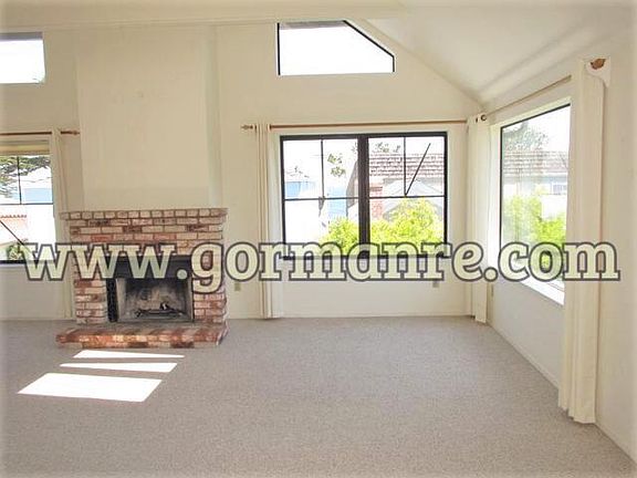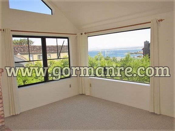 Spectacular bay and city light views from this spacious and light 2 bedroom 2 bathroom upstairs apartment. Located less than a block from Berwick Park and the Recreation Trail, it has access to the beautiful coastline. This unit has approximately 1,150 square feet of living area, all on one level once you climb the stairs to the unit. It is above 5 garages, including the garage for this unit, so there is no one living below you. All rooms except the guest bedroom have spectacular ocean views and vaulted ceilings, providing a light, spacious, and uplifting feeling in this desirable unit. The living room features access to the exterior deck from the front door and a wood-burning used-brick fireplace that has a gas log set already installed. The dining area also has great views and is to the other side of the fireplace, by the kitchen breakfast bar. The kitchen has lots of tile counter space, ample cabinetry, a breakfast bar, a refrigerator, a self-cleaning electric range/oven, a dishwasher, a built-in microwave and a disposal. The master bedroom is very spacious has access to the exterior deck through French doors; it also has its own bathroom with a shower stall. The guest bedroom is ample in size and is located off the hall. The guest bathroom is also in the hallway and features a shower over tub arrangement. The unit has two gas wall furnaces, one in the main room and one in the master bedroom. The a one-car garage below this unit is the middle one and has an automatic door opener and laundry hookups for washer and both gas and electric dryer. Rent includes basic gardening and sewer. No smoke/pets. Available immediately. Owner pays for sewer and basic gardening. Tenant responsible for other utilities.