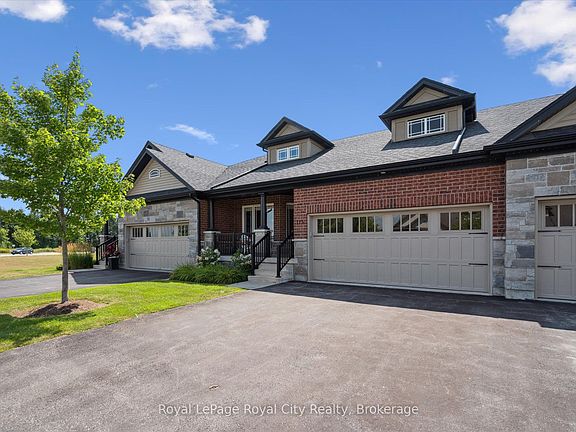 This gorgeous and spacious executive bungaloft townhome in Centre Wellington is truly one of a kind. Built in 2017, this home provides an exceptional blend of luxury and functionality with over 2300 sq ft of living space. The main floor boasts an open-concept layout with a soaring vaulted ceiling in the living area. The large primary bedroom is a serene retreat, complete with an ensuite and a walk-in closet. A convenient main-floor laundry room adds to the ease of single-level living. Step outside from the living room onto the covered and upgraded composite deck, where you can enjoy the peaceful backdrop. The amazing loft level features a large family room, another spacious bedroom, and a full bathroom. The finished walkout lower level is an incredible bonus, offering a huge recreation room, another full bathroom, and workshop/storage space. The lower level walkout opens onto a private patio with a view of the serene greenspace and pond. This property stands out with its unique two-car garage, which includes a hobby mezzanine level AND a separate lower storage level which opens to the backyard as well. Located in a desirable south-end location, you are just minutes away from all the amenities you need and have the perfect commuting location. This is a truly special home that must be seen to be appreciated. Explore the online floorplans and virtual tour, and then book your private viewing today.