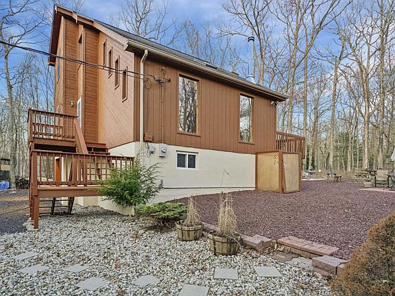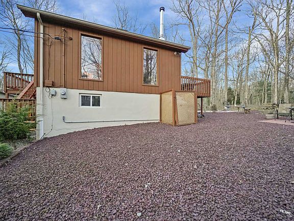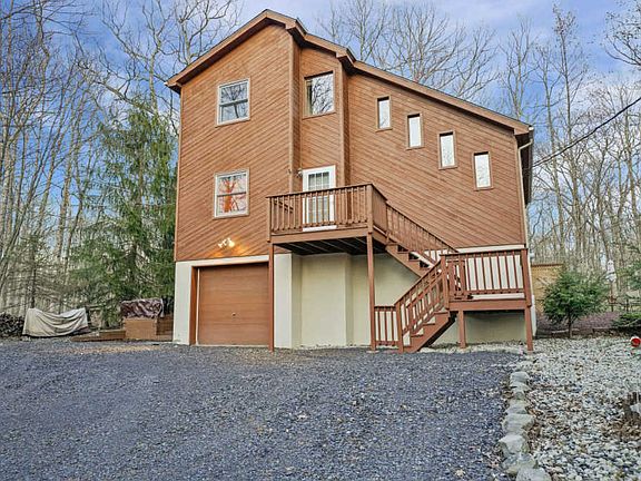 STUNNING CONTEMPORARY OFFERS NATURE'S BEAUTY WITH SHORT STROLL TO LAKE! Just 2 hours from NYC, find this 3 bed, 2 bath home. Cathedral, knotty pine ceilings & hardwood floors offer rustic charm. Open kitchen & living room floor plan w/ cozy wood-burning stove! First floor bedroom & full bath. Upstairs find spacious Master Bed w/ full bathroom & private balcony. Find another spacious bedroom as well! Partially finished basement w/laundry & garage access. Back deck, outdoor dining area, horseshoe pit & view. New Daikin heating/cooling unit installed! Gated entry, security, garbage disposal, pool, playgrounds, tennis courts, 2 well-stocked lakes for fishing & boating. The community has central water/sewer. Home has propane stove w/thermostat in basement which runs without electricity!