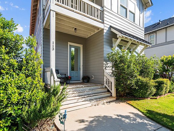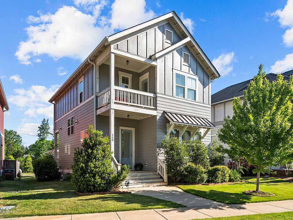 Welcome to 113 Airlie Drive, a charming 3 bedroom, 2 1/2 bath home nestled in the highly sought after neighborhood of Claremont South and within the Chapel Hill school district. This home boasts site-finished hardwoods on the main level, gorgeous quartz counters, shaker cabinets, and modern finishes throughout. Abundant natural light fills every room. The first floor, which features a gas fireplace and beautiful, picturesque windows, is open plan. The living room, dining area and gorgeous kitchen are part of one large space. Note that the kitchen island makes this floorplan unique to this model. Stainless steel appliances, gas range. Just off the kitchen is the rear entry to the home, with a roomy and welcoming mud room, drop zone, laundry, and walk-in pantry. Upstairs features a spacious primary bedroom, with a large walk-in closet and a lovely private balcony. Primary bathroom contains double vanities, quartz counters and an oversized, ceramic tiled, walk-in shower. Just across the hall are 2 bedrooms, which share a hall bath. Outside in back is a 2-car detached garage, and low maintenance backyard. Neighborhood amenities include a pool, clubhouse with fitness room, two playgrounds, and walking/running/biking trails. Awesome location with easy access to UNC, Duke, RTP, and RDU airport.
