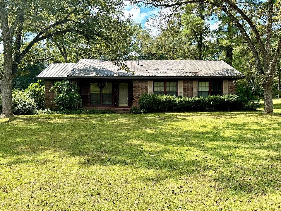Charming Brick Ranch with metal roof nestled on 1.41 acres, shaded corner lot with pecan trees to enjoy front porch sitting. Offers spacious great room with masonry fireplace, natural toned brick feature wall and hearth. Open to dining space and kitchen with convenient side entrance. Primary bedroom has private entrance to the bath. Recent LVP flooring installed in most of the house, needs new flooring in bedrooms, fresh paint and some repairs; being sold as-is. Don't miss this opportunity to make it yours and add your own touches! Call today to schedule showing!