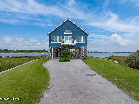 Talk about a view! This 2.2 +/- acre homesite in N Topsail Beach is located on the intercoastal waterway, yet steps to the beach in the cul-de-sac of the Barton Bay Yacht club. This home has so much to offer: Furnished, tongue and groove wood ceilings, 2 boat slips - One Boat dock and one New boat lift in 2022 up to 10,000 pounds, 400 feet of seawall around the home, Newer Roof and roof fans, Newer high impact windows and siding, 2x6 wall construction, custom solid maple cabinetry throughout the home, hardwood floors in the living area, additional accent lighting in the living room/kitchen areas, Large outdoor shower, multiple levels of decks.